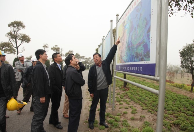 梁學(xué)忠董事長(zhǎng)(右一)介紹條子泥I期工程施工現(xiàn)場(chǎng)平面布置圖